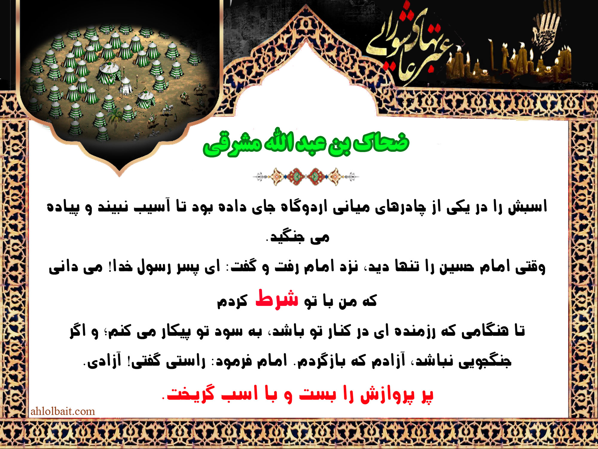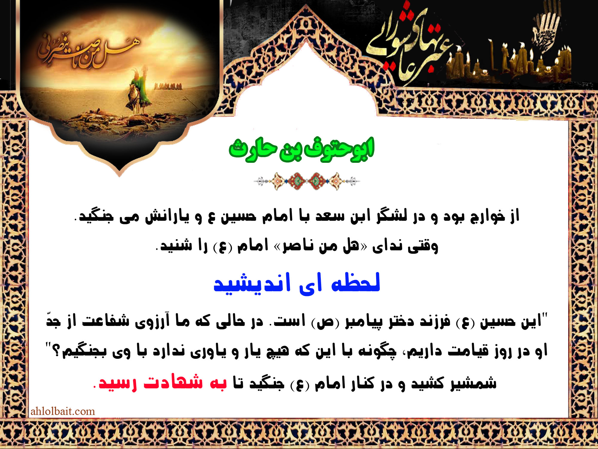 السلام علیک یا اباعبدالله الحسین (علیه السلام) ابوحتوف بن حارث از خوارج بود و در لشگر ابن سعد با امام حسین ع و یارانش می جنگید. وقتی ندای «هل من ناصر» امام (ع) را شنید. لحظه ای اندیشید "اين حسين (ع) فرزند دختر پيامبر (ص) است. در حالى كه ما آرزوى شفاعت از جدّ او در روز قيامت داريم، چگونه با اين كه هيچ يار و ياورى ندارد با وى بجنگم؟" شمشير كشيد و در كنار امام (ع) جنگید تا به شهادت رسید. منبع: موسسه تحقیقات و نشر معارف اهل البیت (علیهمالسلام) موضوعات مرتبط: مناسبات مذهبی، حسینی، تاریخِ اسلام برچسبها: محرم الحرام, عاشورا, عبرت های عاشورا [ دوشنبه نهم مرداد ۱۴۰۲ ] [ 14:28 ] [ انصار صاحب الزمان(عج) ]