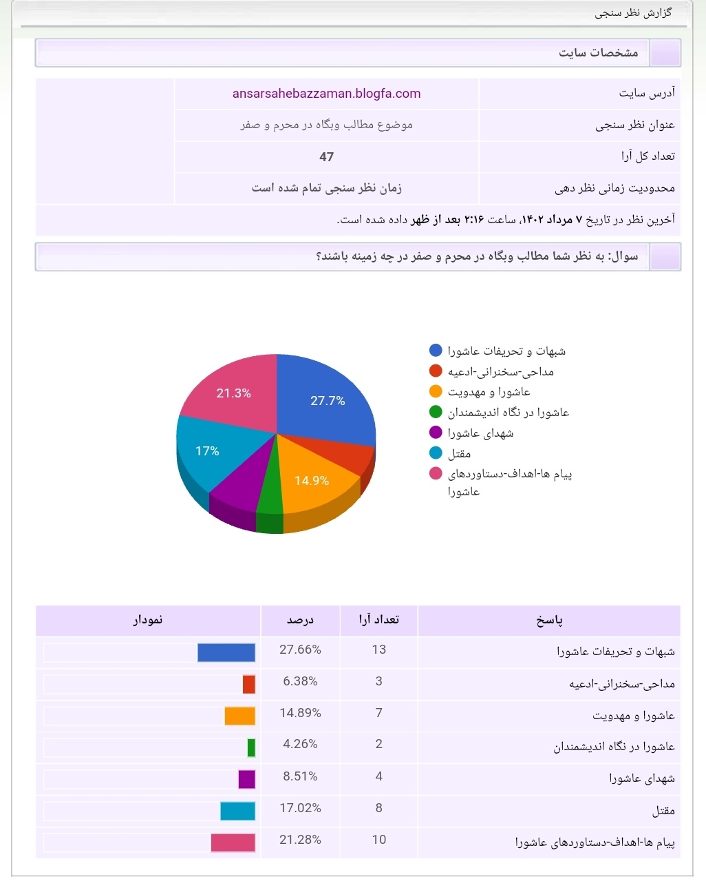 بسم رب الحسین (علیه السلام) سلام و عرض ادب خدمت بازدید کنندگان محترم و همراهان گرانقدر، برادران و خواهران عزیز؛ و عرض تسلیت ایام عزاداری حضرت ارباب، امام حسین (علیه السلام)، علمدار کربلا، حضرت قمر منیر بنی هاشم (علیه السلام) و یاران باوفایشان، با توجه به نتیجه نظر سنجی موضوع مطالب وبگاه در محرم و صفر ، ان شاء الله مطالب آتی وبگاه(به غیر از مطالب مرتبط با مناسبات مذهبی) تا پایان محرم و صفر، حول موضوعاتِ: ⬅️شبهات و تحریفات عاشورا ⬅️پیام ها-اهداف و دستاوردهای عاشورا از کتب و منابع معتبر و موثق، در وبگاه گنجانده خواهند شد. از مشارکت همه بازدید کنندگان و همراهان گرامی در نظر سنجی تشکر می کنیم. منتظر انتقادات، پیشنهادات و نظرات ارزشمند شما هستیم. جهت ارتباط با مدیریت وبگاه می توانید از طریق رایانامه (ایمیل) پیام خود را به آدرس زیر ارسال نمایید: ansarsahebazzamanmanaging@gmail.com التماس دعا وبگاه انصار صاحب الزمان (عجل الله تعالی فرجه الشریف) «منتظران ظهور» عکس نتیجه نظر سنجی موضوع مطالب وبگاه در محرم و صفر: با تشکر از سایت تولز آی آر (طراحی و سرویس دهنده ابزار وبلاگ) موضوعات مرتبط: مناسبات مذهبی، حسینی، هیئتی برچسبها: محرم الحرام, صفر, نظر سنجی [ یکشنبه هشتم مرداد ۱۴۰۲ ] [ 14:30 ] [ انصار صاحب الزمان(عج) ]