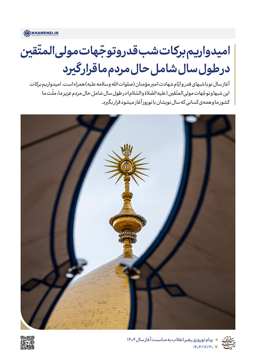 منبع: پايگاه اطلاعرسانی دفتر حفظ و نشر آثار حضرت آيتاللهالعظمی سيدعلی خامنهای (مدظلهالعالی) موضوعات مرتبط: مناسبات مذهبی، سیره اهل بیت(ع)، حسینی، هیئتی برچسبها: شهادت حضرت علی, امیرالمؤمنین, شب قدر, امام علی [ پنجشنبه سی ام اسفند ۱۴۰۳ ] [ 15:28 ] [ انصار صاحب الزمان(عج) ]